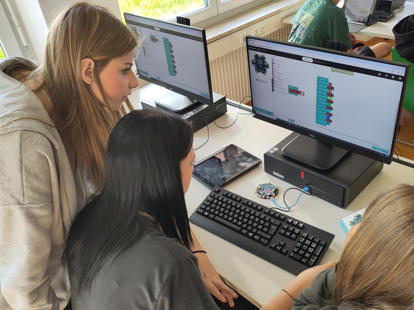 In den vierten Klassen arbeiten wir derzeit im Unterrichtsfach Digitale Grundbildung an einem Calliope Mini- Computer. Der Computer ist auf einer Platine montiert, die auf eine Handfläche passt und er ist mi LED-Anzeige, Lautsprecher, Druckknöpfen und Sensoren bestückt. Am PC entwickeln die SchülerInnen dann mithilfe einer Blockprogrammiersprache kleine Programme. Wir haben schon eine Rakete starten lassen oder uns die Farben des Regenbogens anzeigen lassen. Wenn das selbst erstellte Programm dann tatsächlich funktioniert, sorgt das für Wow-Momente. Den Lehrern, Frau Joas und Herrn Rieser, gefällt es auch. Die Arbeit macht Spaß und die SchülerInnen lernen "Computational Thinking", also zu denken wie ein Computer.